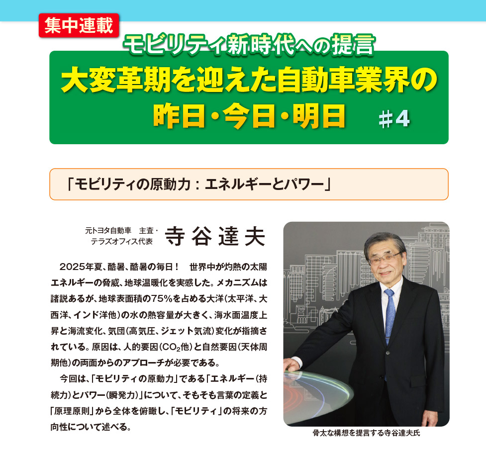 今回は、「モビリティの原動力」である「エネルギー(持続力)とパワー(瞬発力)」について、 そもそも言葉の定義と「原理原則」から全体を俯瞰し、 「モビリティ」の将来の方向性について述べる。