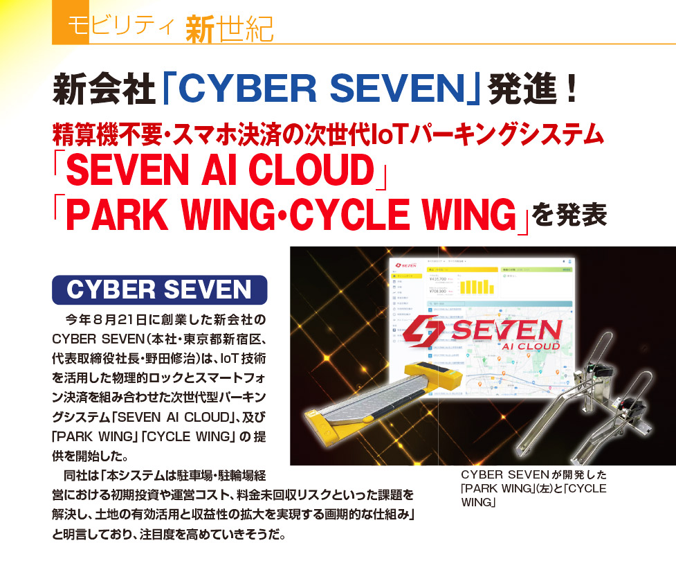 今年8月21日に創業した新会社のCYBER SEVEN(本社・東京都新宿区、代表取締役社長・野田修治)は、 IoT 技術を活用した物理的ロックとスマートフォン決済を組み合わせた次世代型パーキングシステム「SEVEN AI CLOUD」、 及び「PARK WING」「CYCLE WING」の提供を開始した。