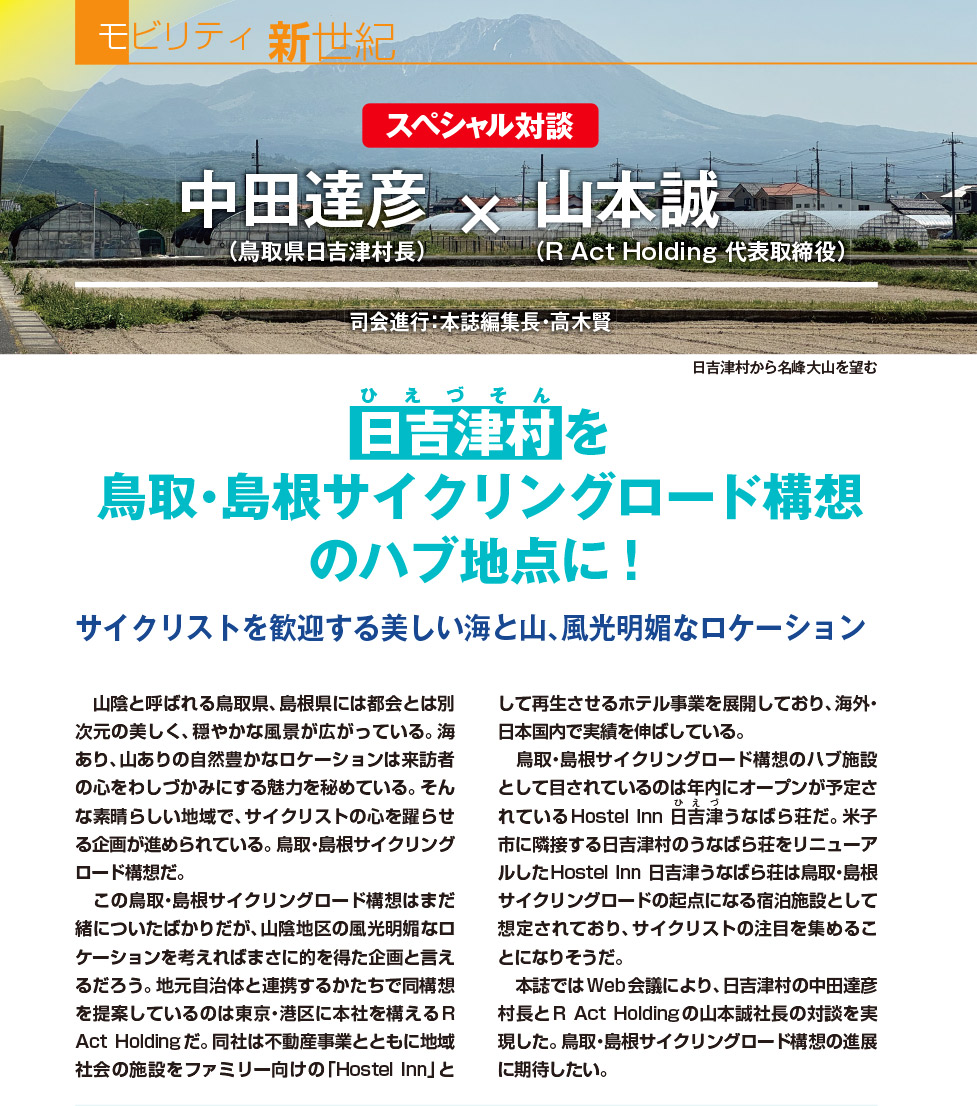 本誌ではWeb会議により、 日吉津村の中田達彦村長とR Act Holding の山本誠社長の対談を実現した。 鳥取・島根サイクリングロード構想の進展に期待したい。