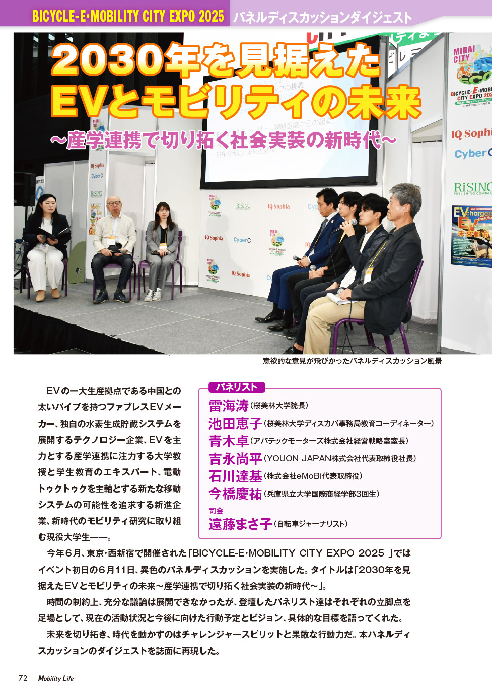 今年6月、東京・西新宿で開催された「BICYCLE-E・MOBILITY CITY EXPO 2025」では イベント初日の6月11日、異色のパネルディスカッションを実施した。 タイトルは「2030年を見据えたEVとモビリティの未来~産学連携で切り拓く社会実装の新時代~」。