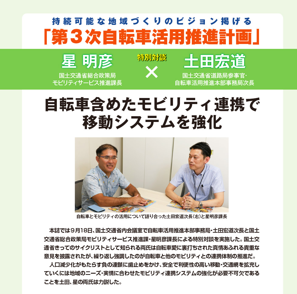本誌では9月18日、国土交通省内会議室で自転車活用推進本部事務局・土田宏道次長と国土交通省総合政策局モビリティサービス推進課・星明彦課長による特別対談を実施した。国土交通省きってのサイクリストとして知られる両氏は自転車愛に裏打ちされた真情あふれる貴重な意見を披露されたが、繰り返し強調したのが自転車と他のモビリティとの連携体制の推進だ。