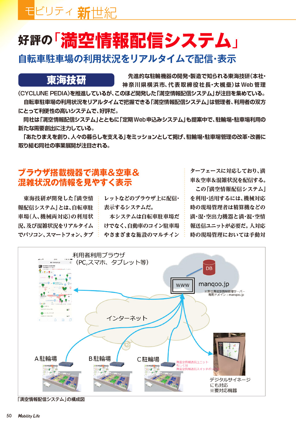 先進的な駐輪機器の開発・製造で知られる東海技研(本社・神奈川県横浜市、代表取締役社長・大槻壘)は Web 管理(CYCLUNE PEDIA)を推進しているが、このほど開発した「満空情報配信システム」が注目を集めている。