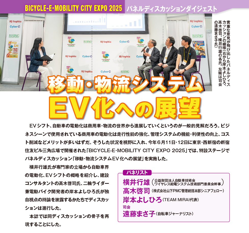 EVシフト、自動車の電動化は商用車・物流の世界から進展していくというのが一般的見解だろう。ビジネスシーンで使用されている商用車の電動化は走行性能の強化、管理システムの機能・利便性の向上、コスト削減などメリットが多いはずだ。そうした状況を視野に入れ、今年6月11日・12日に東京・西新宿の新宿住友ビル三角広場で開催された「BICYCLE-E・MOBILITY CITY EXPO 2025」では、特設ステージでパネルディスカッション「移動・物流システムEV化への展望」を実施した。