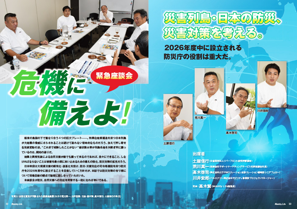 日本政府は大規模災害の頻発化・激甚化を受け、 防災・災害対応の司令塔機能を持つ防災庁を2026年度中に設立することを目指していく方針だが、 本誌では防災対策の有り様について現場目線の観点で論客に話し合っていただいた。