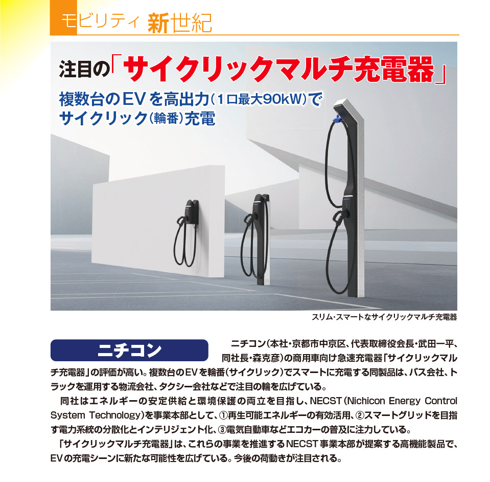 ニチコン(本社・京都市中京区、代表取締役会長・武田一平、同社長・森克彦)の商用車向け急速充電器「サイクリックマルチ充電器」の評価が高い。 複数台のEVを輪番(サイクリック)でスマートに充電する同製品は、 バス会社、トラックを運用する物流会社、タクシー会社などで注目の輪を広げている。