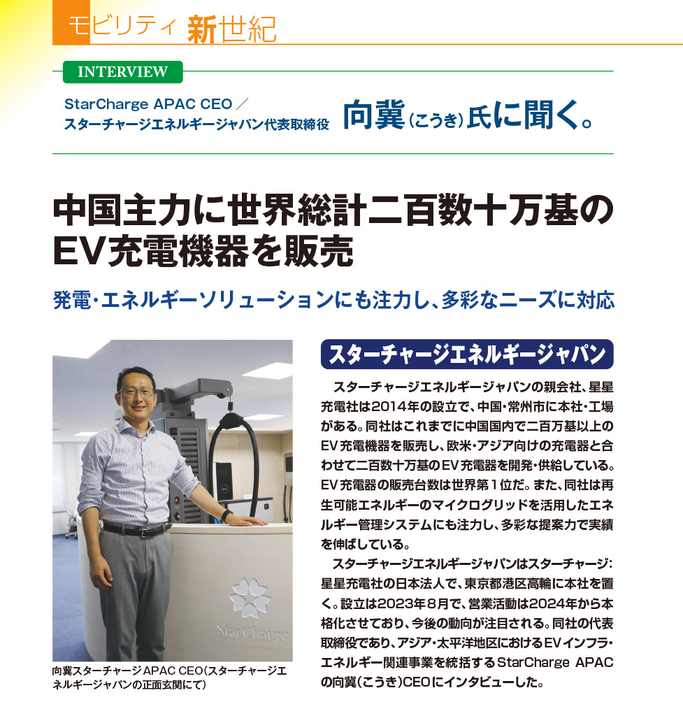 スターチャージエネルギージャパンはスターチャージ:星星充電社の日本法人で、 東京都港区高輪に本社を置く。 設立は2023年8月で、営業活動は2024年から本格化させており、今後の動向が注目される。 同社の代表取締役であり、 アジア・太平洋地区におけるEVインフラ・エネルギー関連事業を統括するStarCharge APACの向冀(こうき)CEOにインタビューした。
