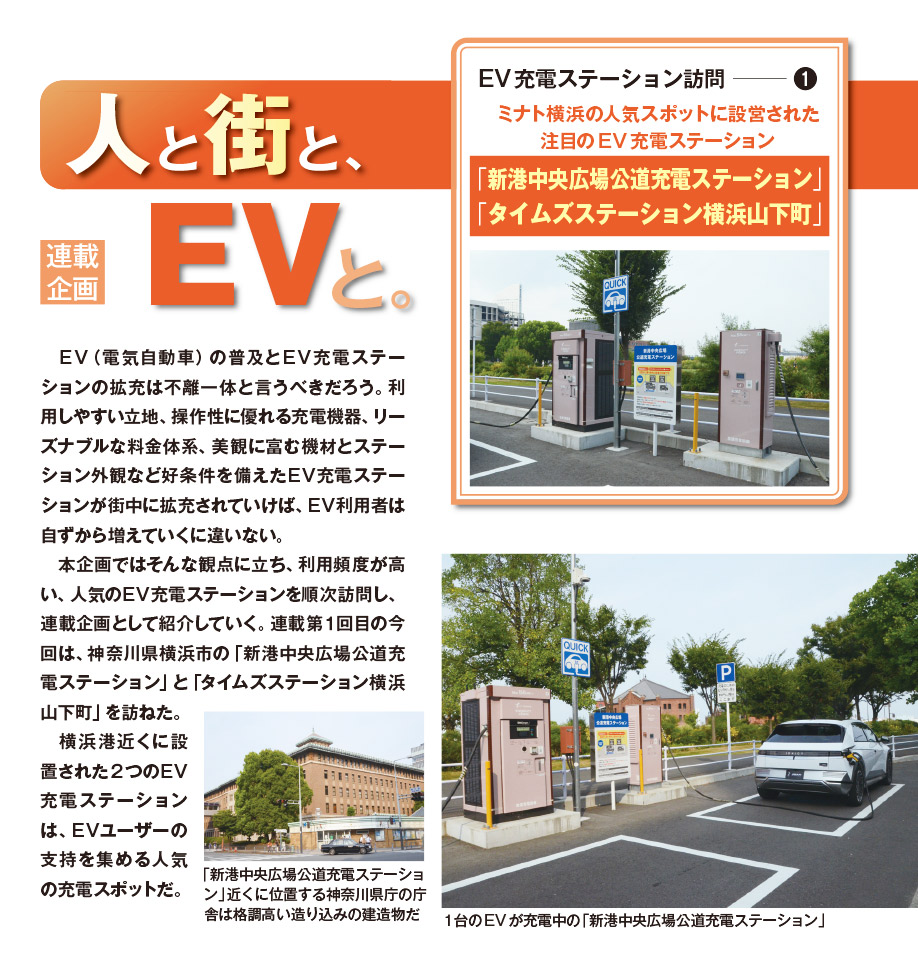 本企画ではそんな観点に立ち、利用頻度が高い、人気のEV充電ステーションを順次訪問し、連載企画として紹介していく。 連載第1回目の今回は、 神奈川県横浜市の「新港中央広場公道充電ステーション」と「タイムズステーション横浜山下町」を訪ねた。
