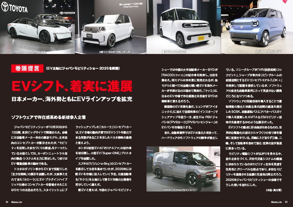 モビリティ電動シフトが広がりを見せる中、 新たなまちづくり、次世代交通システムの構築に求められているのはモビリティ全体を見渡す先見性とグローバルな視点であり、 多彩なモビリティを連携させる協調と先進性の両立だろう。 2025年ジャパンモビリティショーの会場でそうした想いを新たにした。