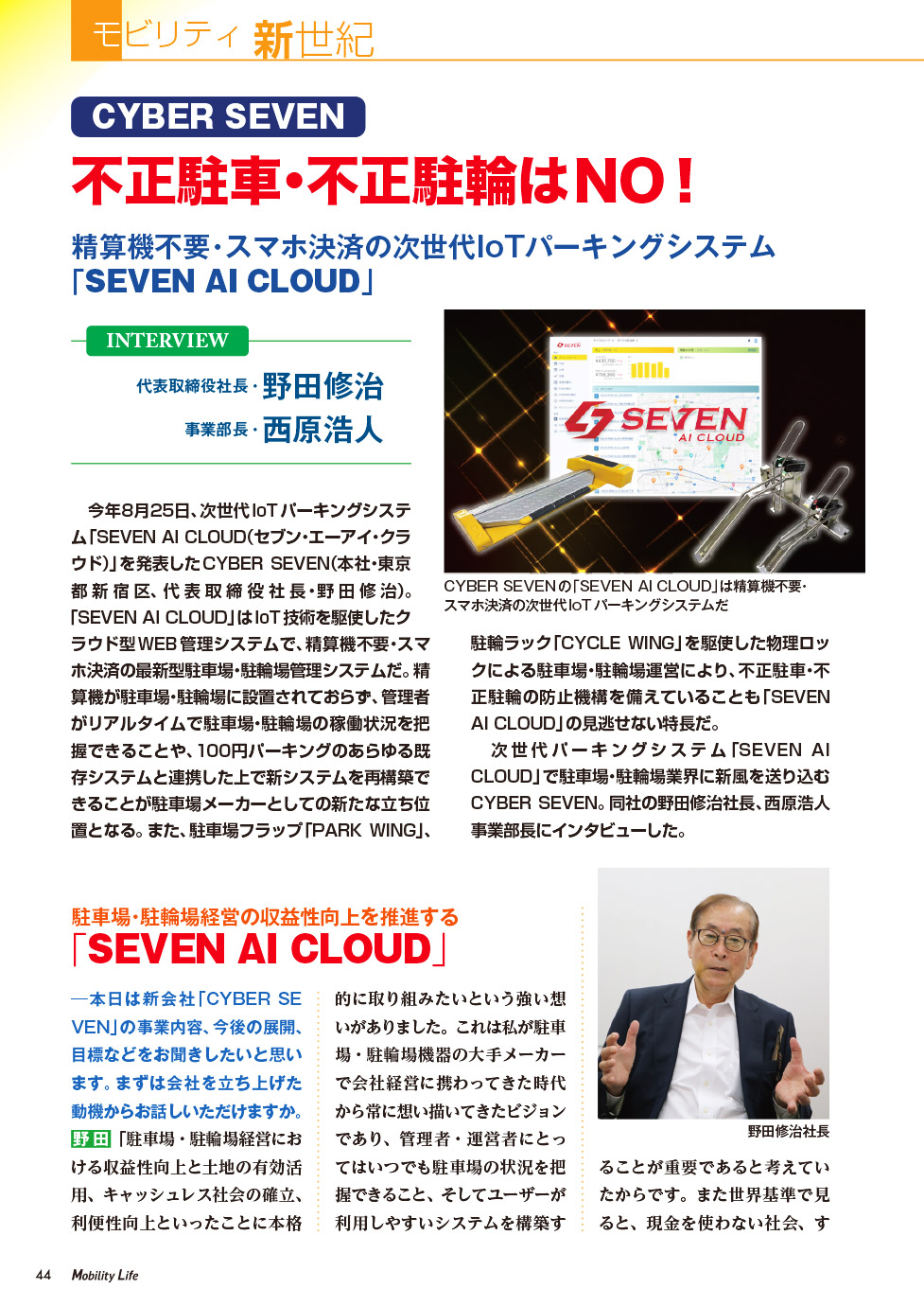 次世代パーキングシステム「SEVEN AI CLOUD」で 駐車場・駐輪場業界に新風を送り込むCYBER SEVEN。 同社の野田修治社長、西原浩人事業部長にインタビューした。